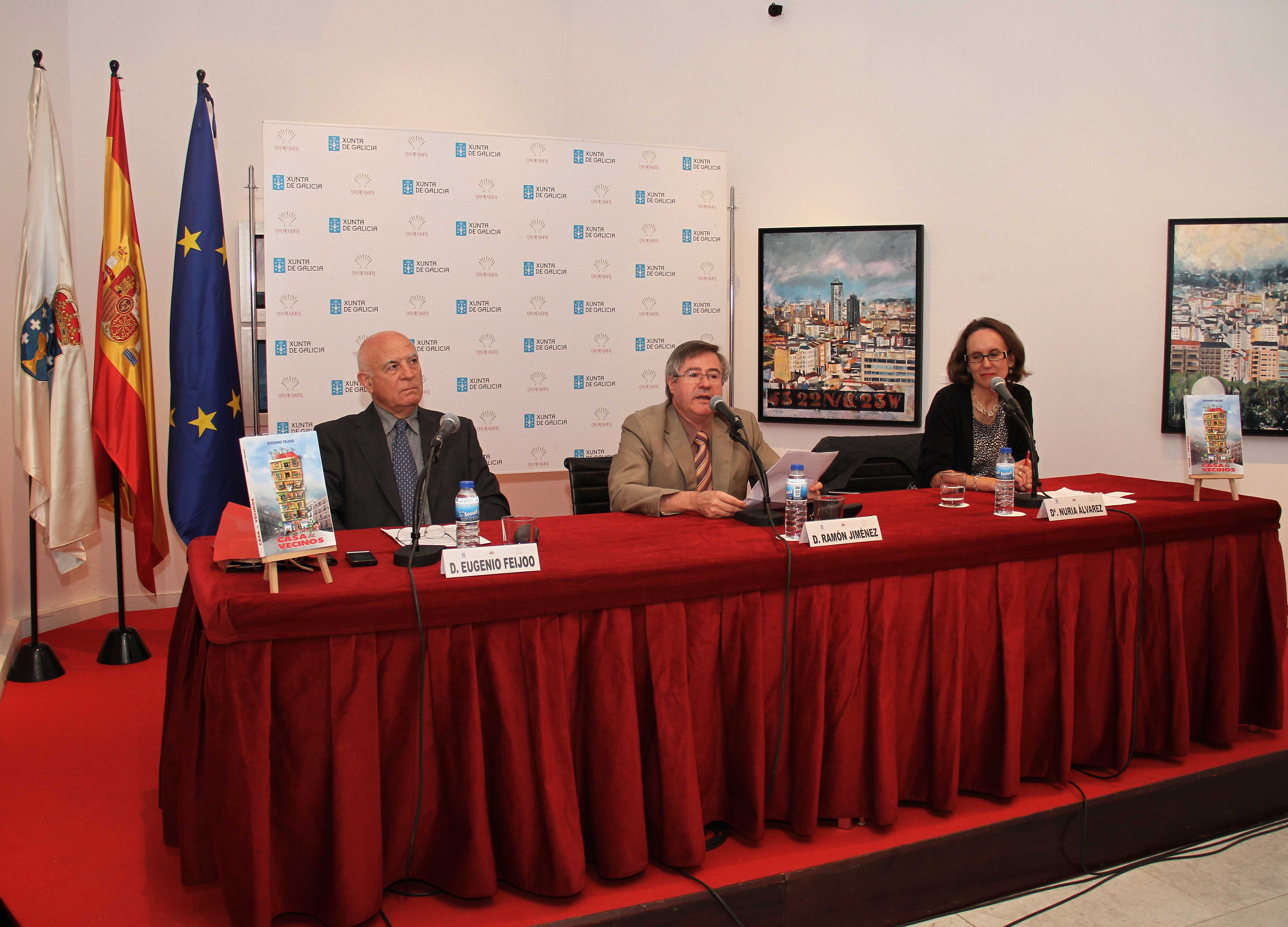 A Casa de Galicia, delegación da Xunta de Galicia en Madrid, acolleu esta tarde a presentación da novela "Casa de veciños", do escritor e xornalista Eugenio Feijoo, publicada por Edicións Correo. Trátase dunha obra costumista actual que narra as vivencias de medio centenar de persoas dun barrio, das cales, trinta habitan na mesma casa. O relato é unha análise sociolóxica informal aderezada con certo sentido do humor e no que aparecen as novas tendencias nas relacións sociais e familiares, a complexa convivencia e a delicada confluencia de intereses na comunidade na que conviven tres xeracións.